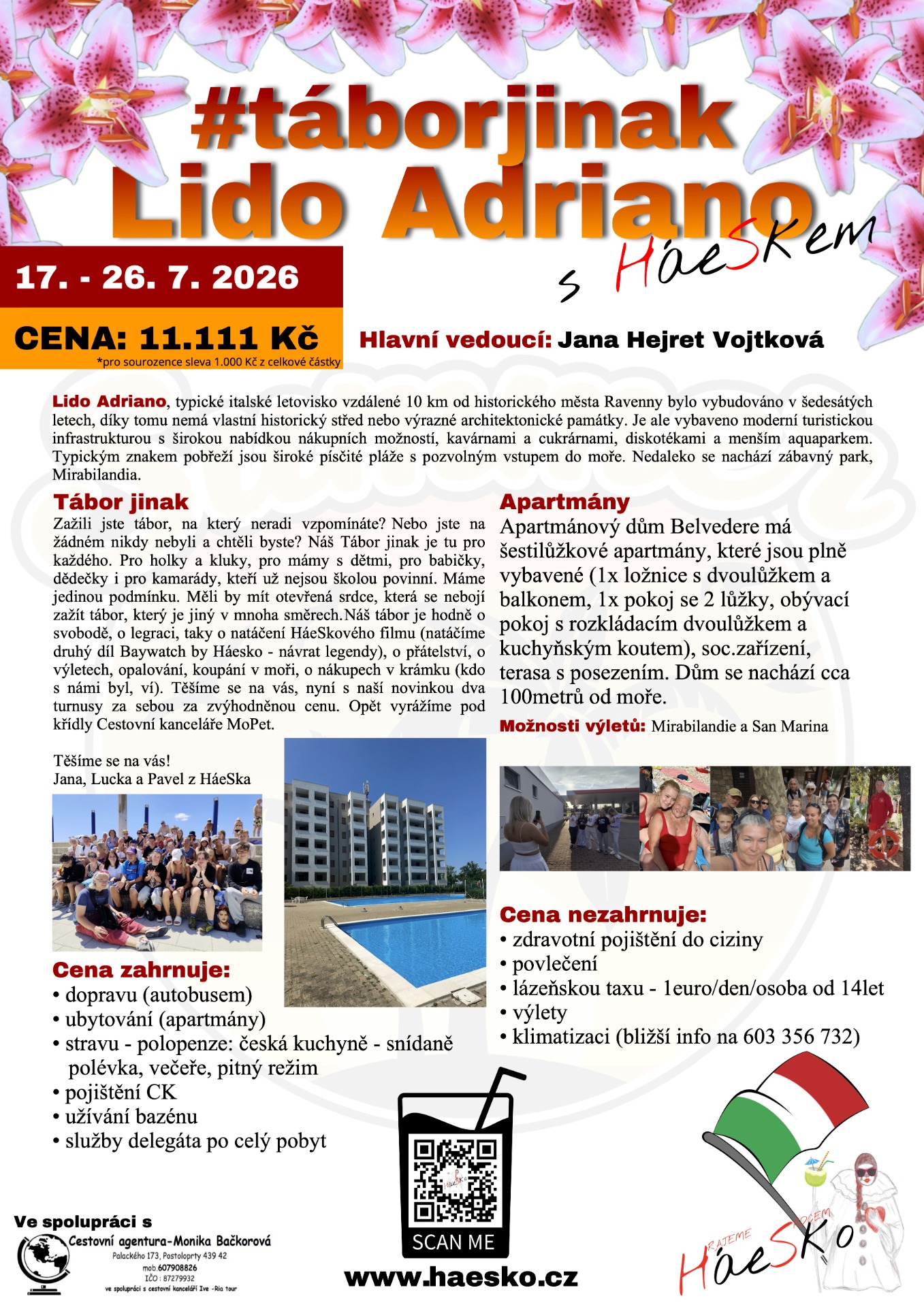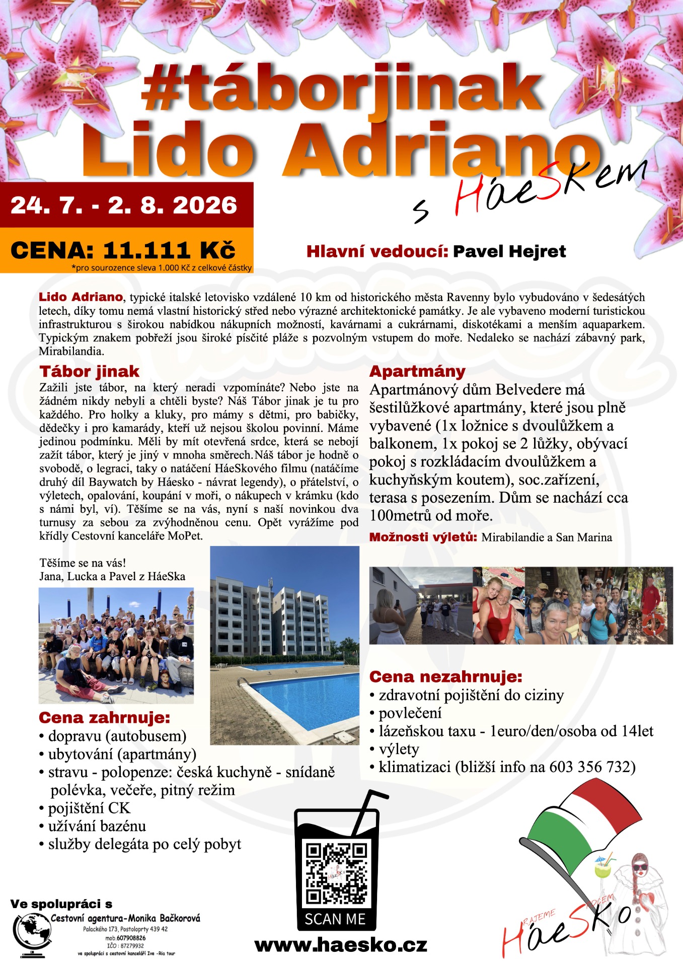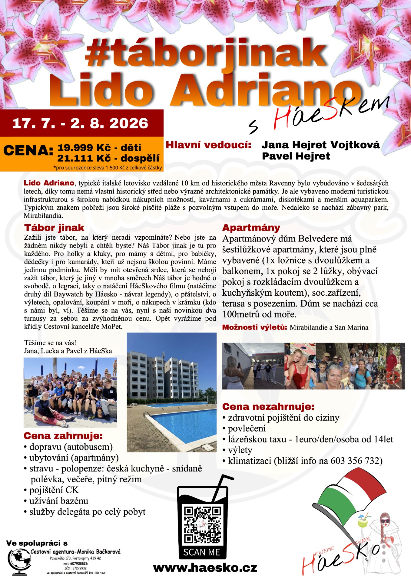 Zažili jste tábor, na který neradi vzpomínáte? Nebo jste na žádném nikdy nebyli a chtěli byste? Náš Tábor jinak je tu pro každého. Pro holky a kluky, pro mámy s dětmi, pro babičky, dědečky i pro kamarády, kteří už nejsou školou povinní. Máme jedinou podmínku. Měli by mít otevřená srdce, která se nebojí zažít tábor, který je jiný v mnoha směrech.Náš tábor je hodně o svobodě, o legraci, taky o natáčení HáeSkového filmu (natáčíme druhý díl Baywatch by Háesko - návrat legendy), o přátelství, o výletech, opalování, koupání v moři, o nákupech v krámku (kdo s námi byl, ví). Těšíme se na vás, nyní s naší novinkou dva turnusy za sebou za zvýhodněnou cenu. Opět vyrážíme pod křídly Cestovní kanceláře MoPet.